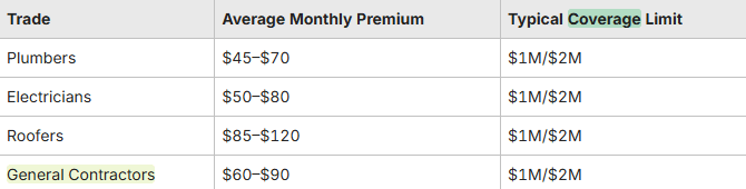 Here’s a general comparison of average monthly general liability premiums based on contractor trade: